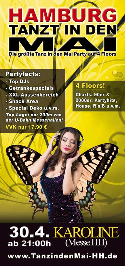 Hamburg tanzt in den Mai heißt es am 30.04. ab 20 Uhr in der exklusiven Location KAROLINE (Messe Hamburg). Mit unseren TOP Acts und vielen Highlights auf 2 Ebenen, erlebt Ihr eine unvergessliche Nacht mit dem besten Sound der Stadt, wo für jeden etwas dabei sein wird. Sichert Euch Tickets für nur 17,90 Euro im VVK (Klick hier)!